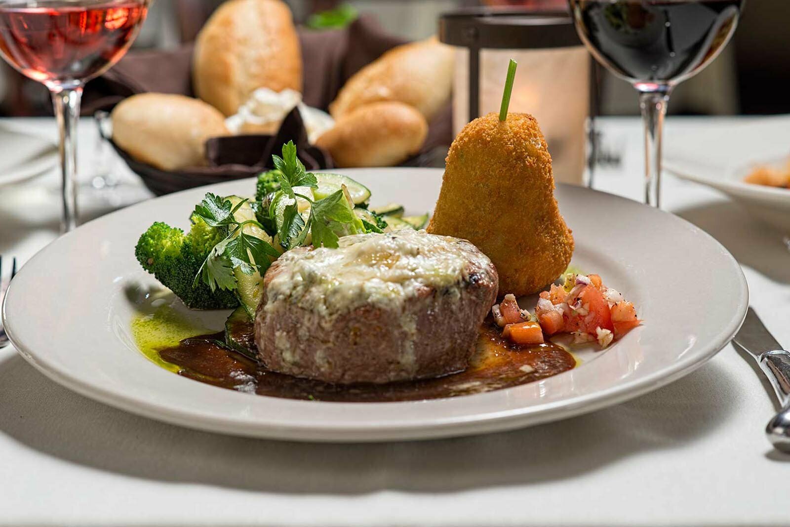 Tender filet mignon Coated in Cracked Peppercorns, with a potato croquette and sautéed spinach. Cognac Cream sauce Our house-made pastas are also available.